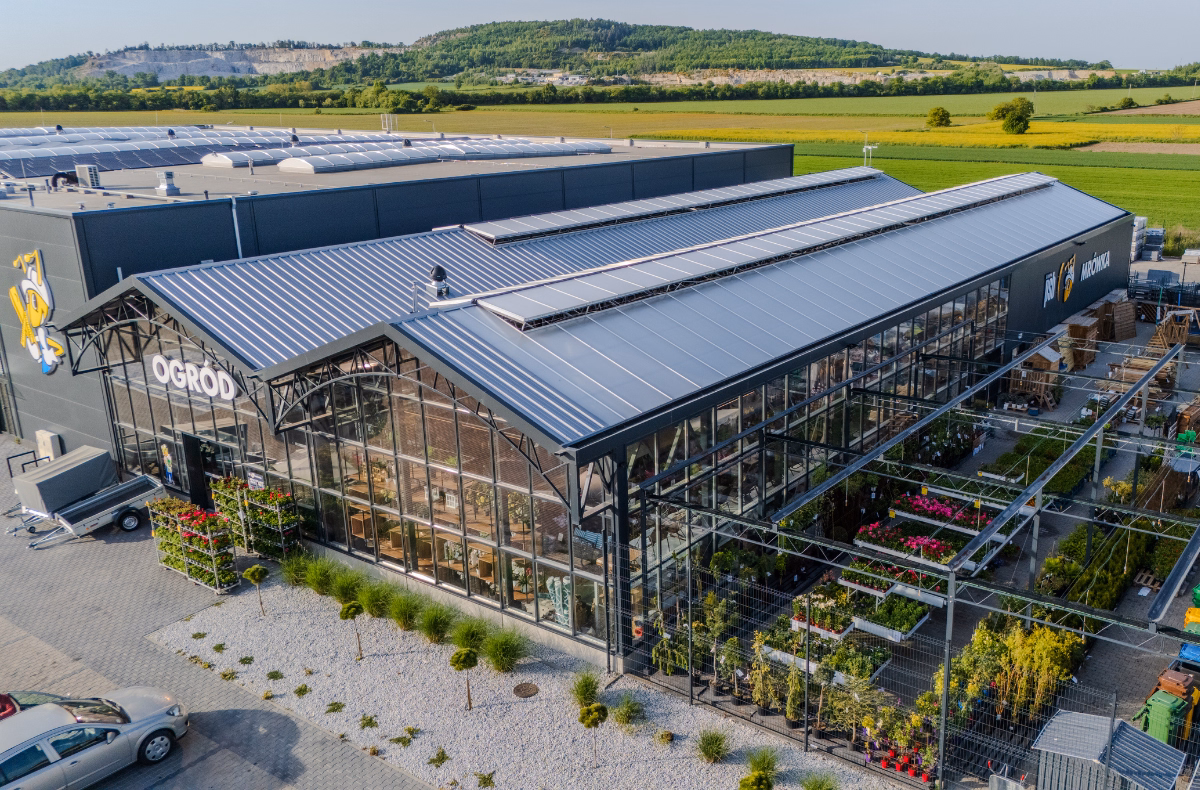 Część ogrodowa zaprojektowana jako integralne przedłużenie hali handlowej – w pełni zgodna pod względem konstrukcji i formy wizualnej.