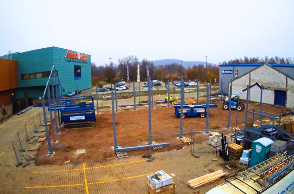 Precyzyjne połączenie nowej konstrukcji stalowej działu ogród z istniejącym, betonowym budynkiem marketu wymagało bardzo dokładnych pomiarów oraz dopasowania elementów do zastanej geometrii obiektu. Zachowanie właściwych tolerancji montażowych było kluczowe dla zapewnienia stabilności konstrukcji, szczelności połączeń oraz prawidłowej współpracy obu obiektów.
