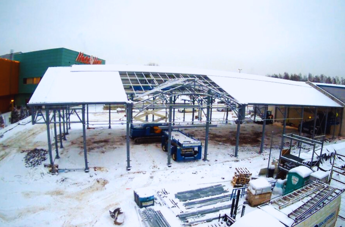 Konstrukcja zaplanowana tak, aby pasowała do budynku marketu i razem z nim tworzyła spójny wizualnie obiekt handlowy.