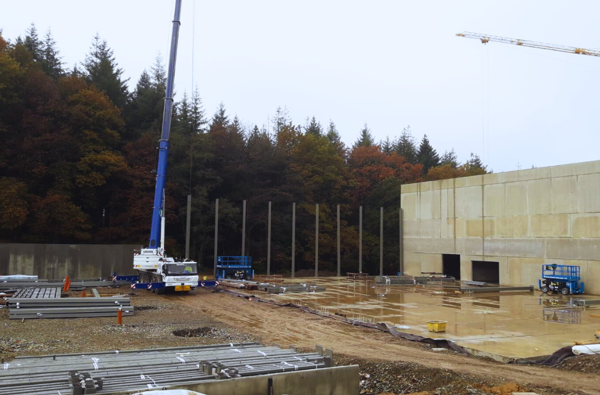 Realizacja obiektu prowadzona była w wyraźnym zagłębieniu terenu, zlokalizowanym w bezpośrednim sąsiedztwie autostrady. Różnica wysokości wynosząca około 20 metrów na odcinku 100 metrów miała istotny wpływ na organizację placu budowy, logistykę dostaw oraz sposób montażu konstrukcji. Ukształtowanie terenu wymagało zastosowania ciężkiego sprzętu, w tym dużego żurawia, a także szczególnego podejścia do kwestii odwodnienia oraz stabilności robót prowadzonych na poszczególnych etapach realizacji.
