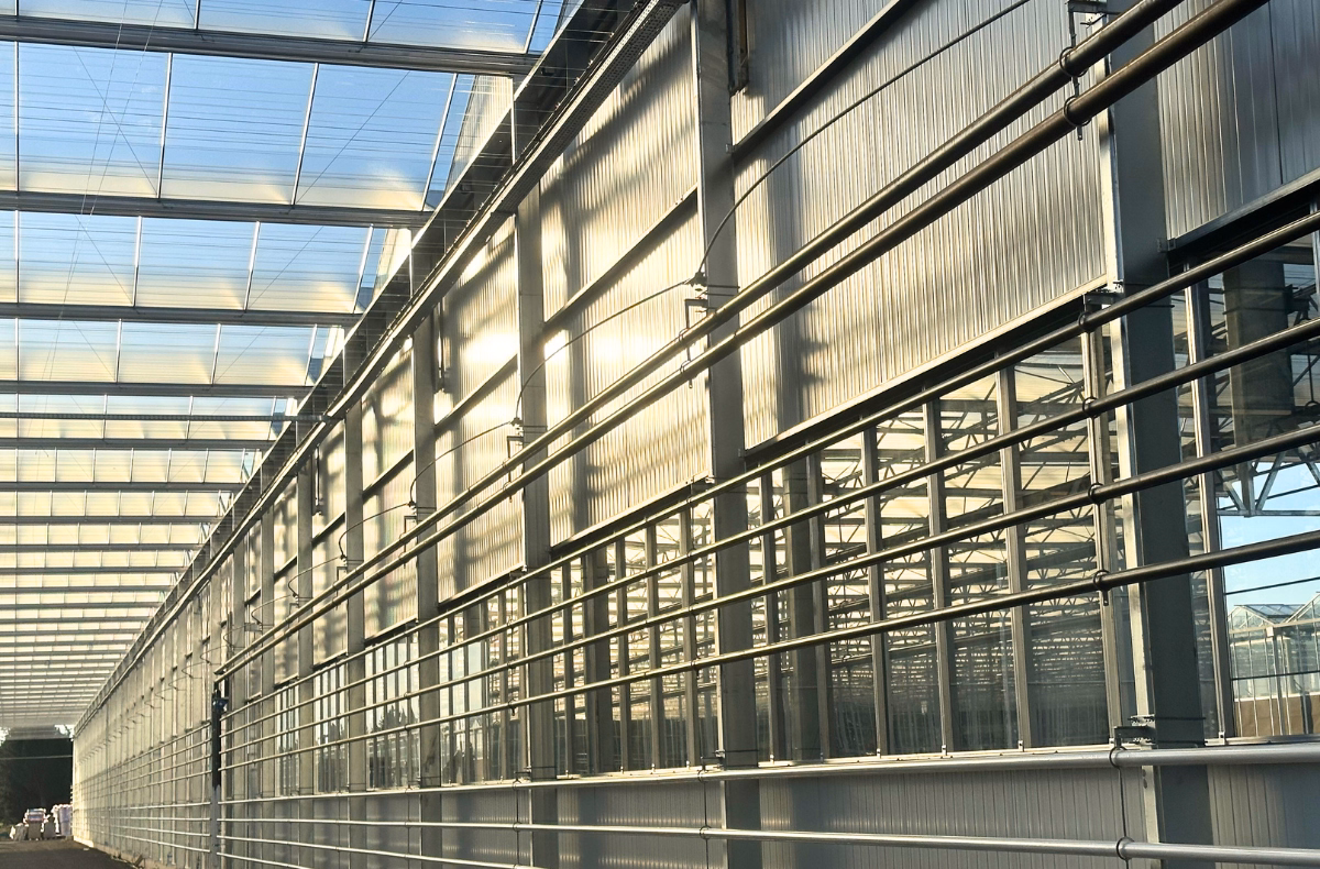 Ściana hali sandwich zintegrowanej z konstrukcją szklarniową.