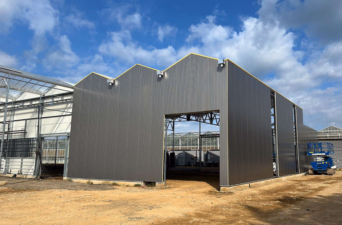 Gotowa hala techniczna przy szklarni wykonana w technologii paneli sandwich.